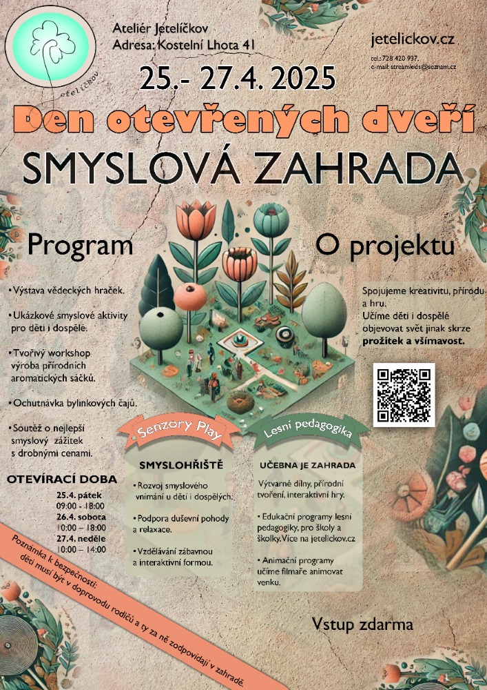 Od 25. do 27. dubna 2025 se v Kostelní Lhotě koná Den otevřených dveří Smyslové zahrady a Smyslohřiště. Akce proběhne v ateliéru Jetýlkov a je určena pro všechny věkové kategorie. Přijďte se pobavit a poznat přírodu v novém světle!